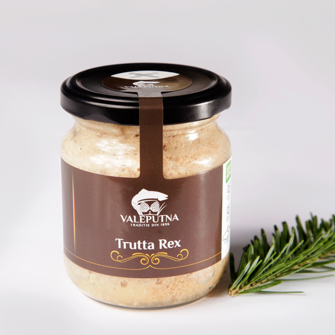 Gramaj: 210 g Ambalare: borcan Descriere: Pasta de păstrăv Trutta Dux conține păstrăv afumat (45%), smântână din lapte de vacă (25%), cremă de brânză (bio) din lapte de vacă (25%), hrean, limes, ceapă chivas, sare, piper. Nu conține conservanți, aditivi sau alte chimicale. Acest produs românesc a câștigat 2 stele de aur Superior Taste Award 2016.